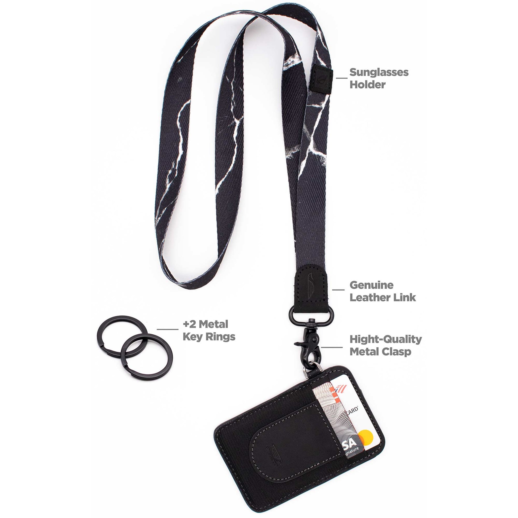 The POCKT® Neck Lanyard is a lightweight, hands-free carry solution for your keys, card holder, ID badge, and everyday essentials. Made from soft polyester fabric with genuine leather hardware and a high-quality metal clasp, it's built for all-day comfort without sacrificing style. The secure clasp attaches easily to any POCKT® card holder or wallet, and the 2 included key rings handle your keys, car fob, or accessories. Available in a wide range of unique patterns, it's a practical everyday accessory and a great gift for any occasion. Ships in a POCKT® branded gift envelope — no extra wrapping needed.